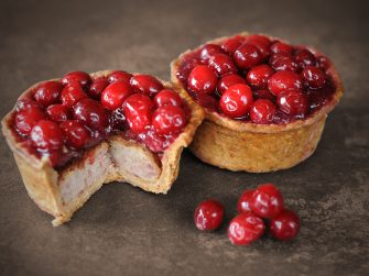 Prime British Quality Assured Pork meat encased in a traditional hot water pastry crust, topped with cranberry sauce, finished with cranberries